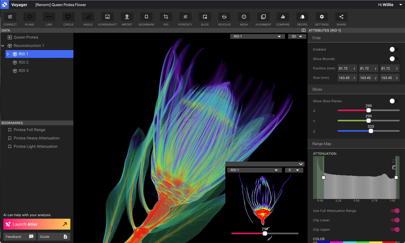 This feature allows a user to zoom into specific areas of the scan. By zooming in, it allows regions to be excluded, while also bringing chaining tools into a workflow. The region of interest tool allows users to align the scan to a specific, user-defined coordinate system, enhance the resolution of specific areas of the scan, and enhance contrast by removing high or low-density materials. It is important to note that the region of interest tools can be nested upon each other.